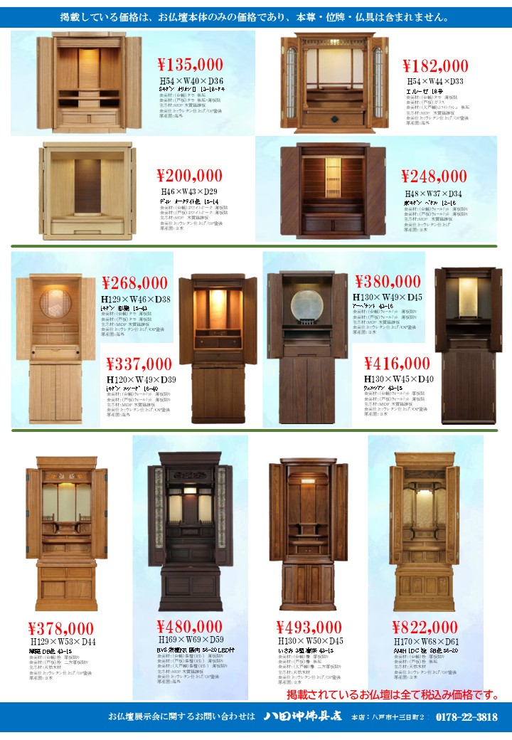 Information お仏壇展示会を開催します イベント 八田神仏具店 お仏壇展示会を開催します。 場所 報恩会館下長 日時 11月8日(土)10:00~17:00 11月9日(日)10:00~15:00 ご予約の上、ご来場の方にはBOXテッシュをプレゼント 特別価格で皆様のお越しをお待ちしております。 戻る